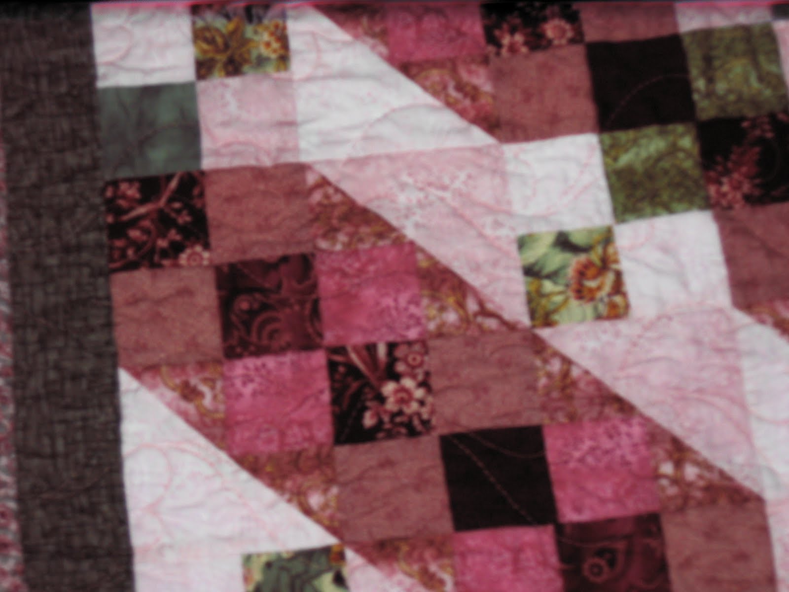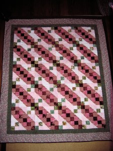 Now that Christmas is over and all the boxes arrived at their intended destinations, I can show some more quilts. This one is a Jacob’s ladder. It’s about 55×70. Pretty standard pattern in pink, burgundy and green. I sent it out for Deb to quilt and yet again, it looks great. No close-ups on the quilting though, sorry.