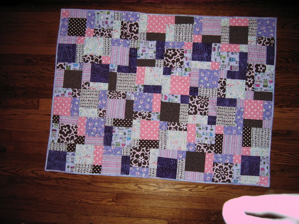 Have you ever made a quilt that you just hated everything about it? This is one of those for me. I made it to order for a client who wanted pink, brown and purple. I had a devil of a time finding fabrics that go together. Most of the pinks that go with brown are of a slightly orangier tone like the reproduction fabrics. Baby pinks are truer pinks. Plus, because I was on a budget I was limited to the selections at my JoAnn’s. Now the pink and brown prints go pretty well together, and the pink and purple prints work too. When you mixed them up….well…it’s not my favorite quilt ever (Sorry, P.).