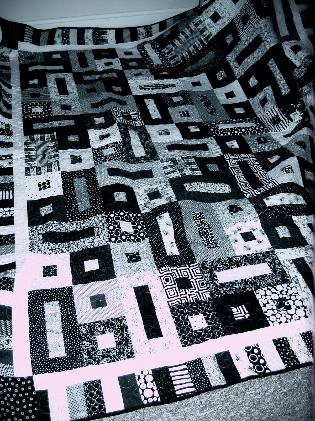 Here’s another of my niece/nephew quilts. Number 4 of 8. This one has actually been done for awhile so I can’t really call it a completion for 2009, though I did just get the label on it. Sorry for the lackluster photo. The quilt is black and white…no pink at all. It’s an issue with the camera flash and poor lighting. The pattern came from http://quilting.about.com/. There are lots of free patterns available there. The whole thing is made with 2 1/2″ strips so it would be very jelly roll friendly. I had a lot of fun picking out fabrics for this. There are probably 30 or 40 different fabrics in it.