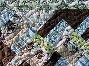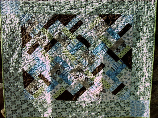 This quilt is a rail fence type pattern with the blocks set on point. It is shades of turquoise, teal, brown, tan and green. I started with a set of 2.5″ strips and just started sewing. This one I quilted myself and it turned out quite nicely.