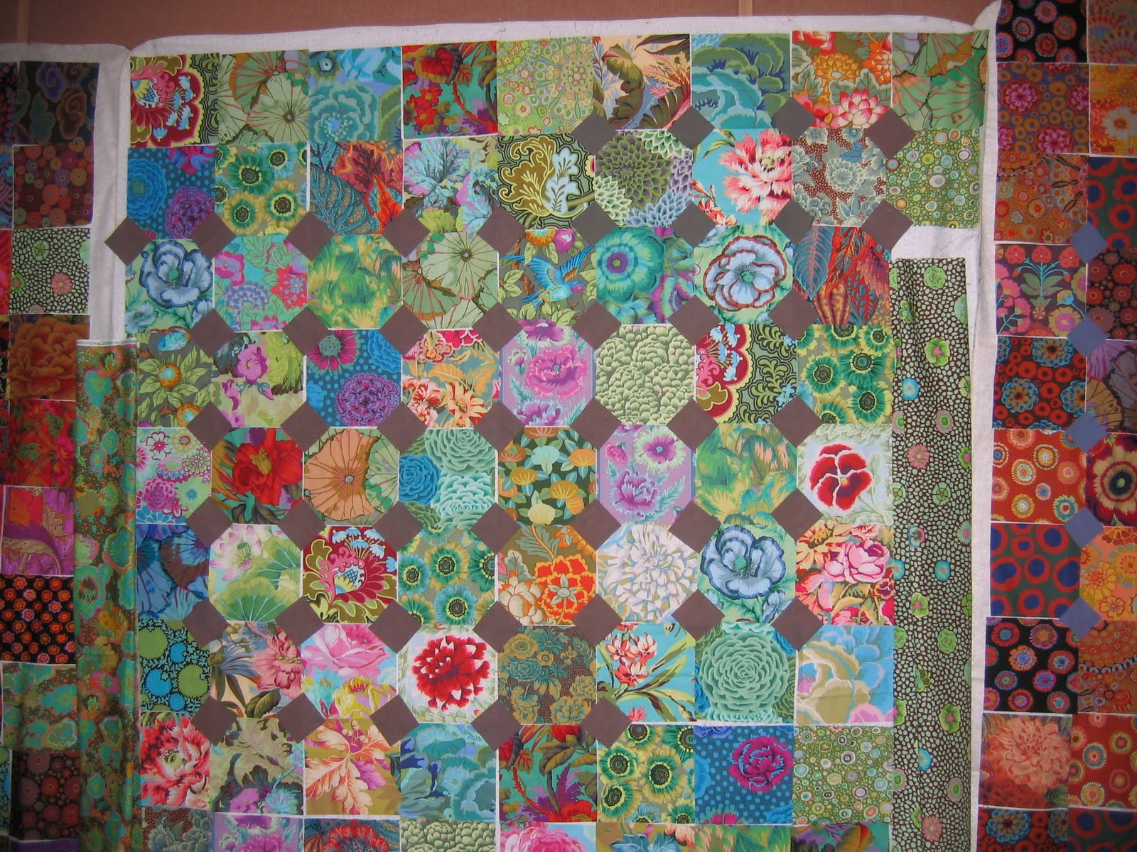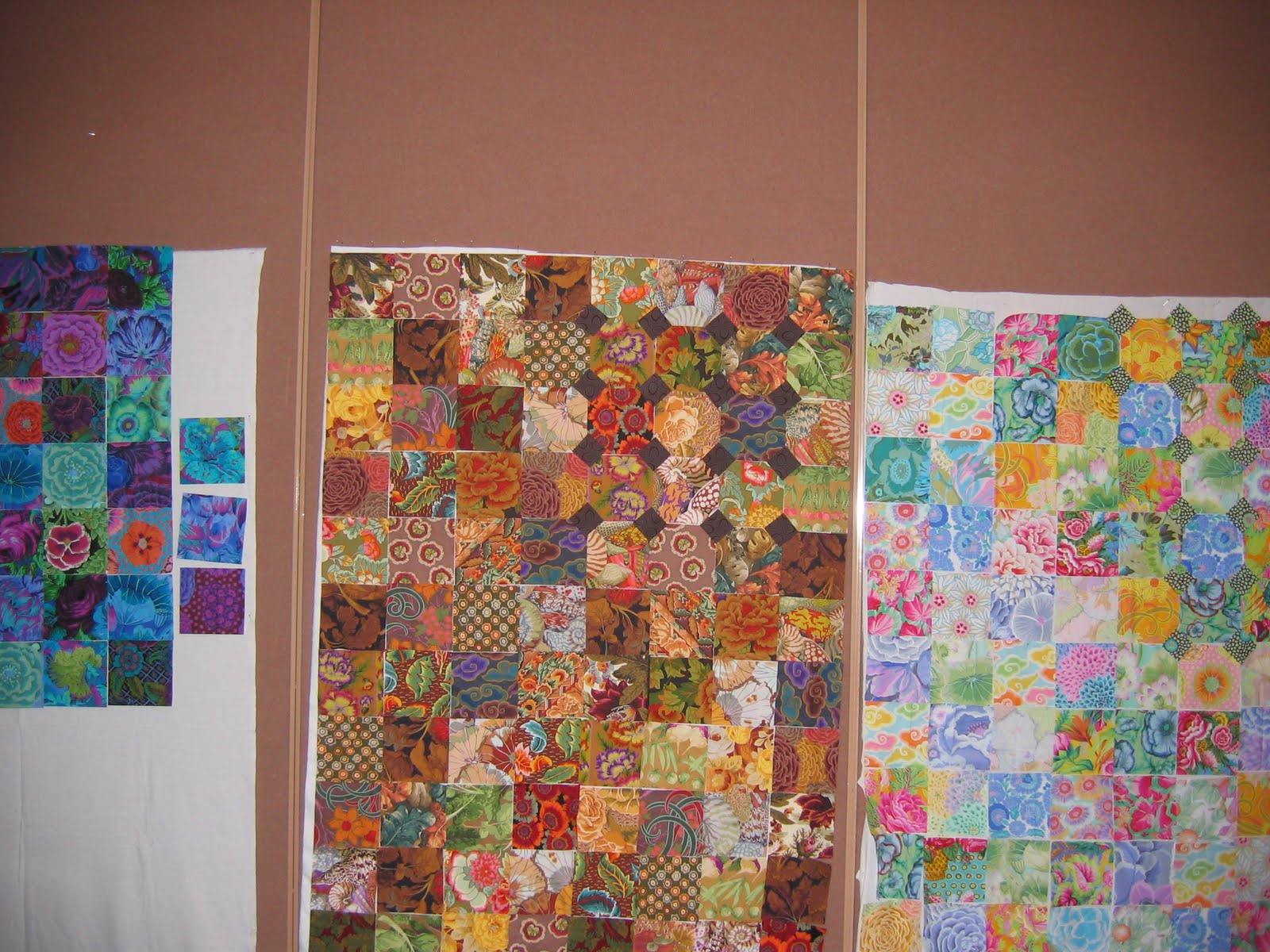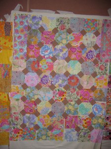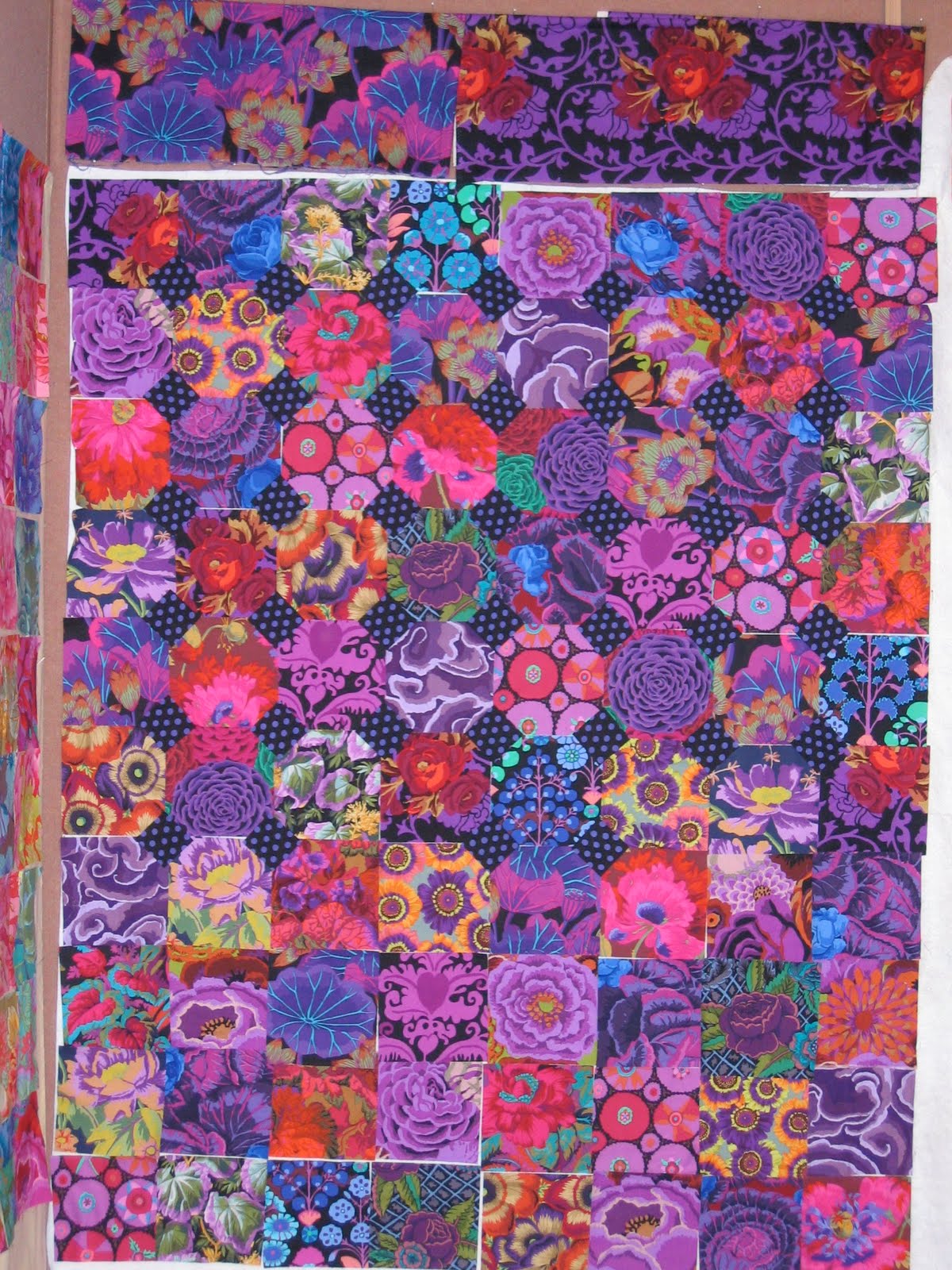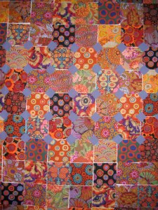 This lovely specimen below is mine. I probably won’t make it bed-sized, but it is fun fabric. I’m planning to use the fabric on the top right as the border. To make it queen size you need 600 some small squares. That’s more cutting than i want to do.