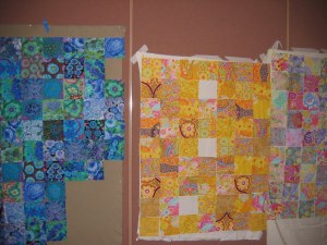 First off, we cut squares. Almost everybody had different color schemes. It was fascinating to see what everyone brought. We did that til noon, then we chose the color that would make the snowball block. Just look what everyone came up with.