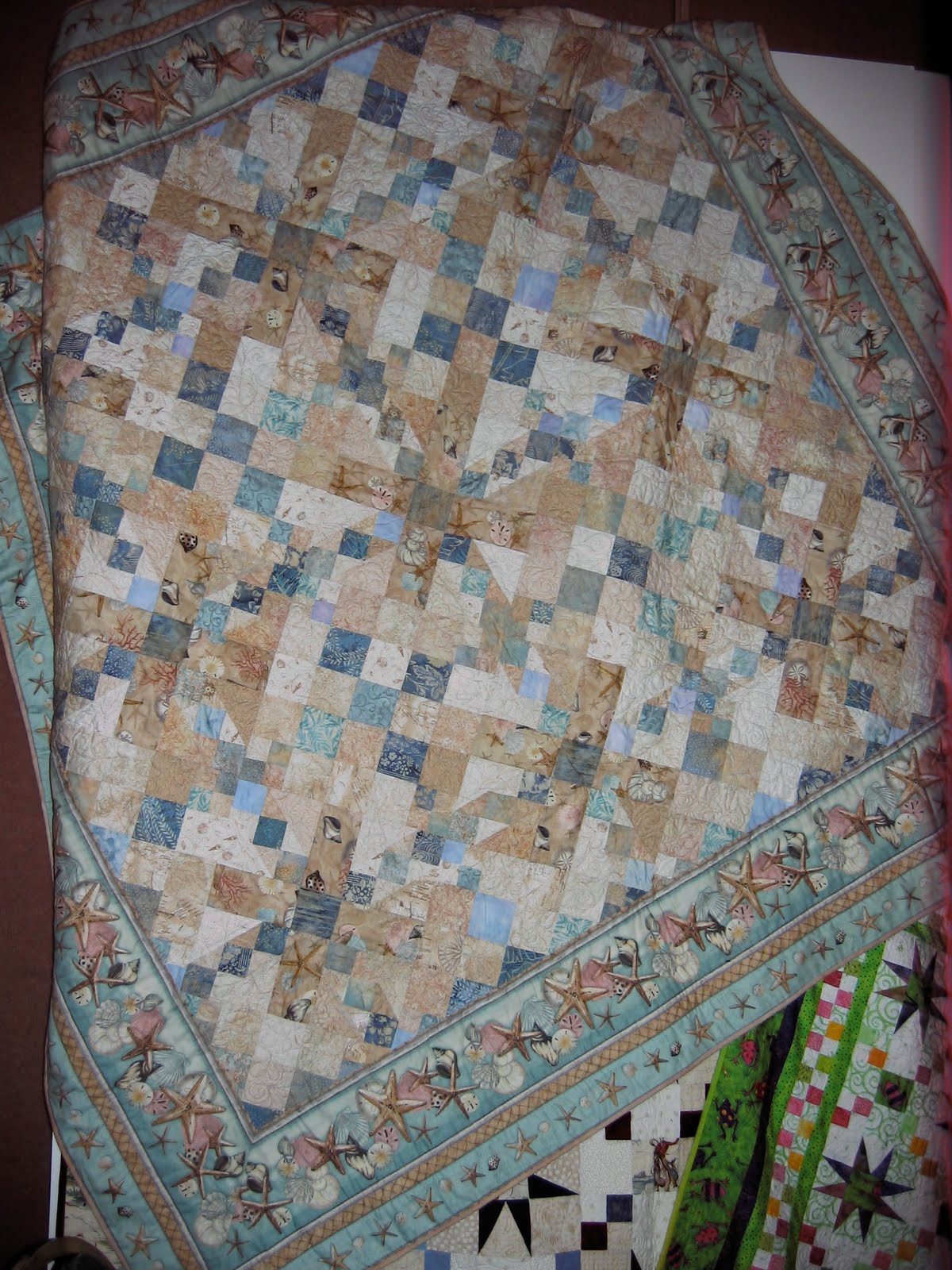 My third class at the Chicago quilt festival was by Charlotte Angotti. This year’s mystery quilt was called Bliss and it’s in dreamy shades of sea and sand. It finishes around 70″ square. I didn’t purchase her border print. It just didn’t do anything for me, so I’ll need to find something else. Sewing went quite well til the end of the afternoon. There are two blocks and I switched pieces between them. Ugh. Got them ripped apart, but not sewn back together.