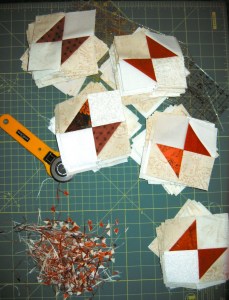 I got to the end of sewing pairs of blocks and realized I was 3 triangles short (sigh), but I cut them out anyway to finish this step. Even though it was around midnight.