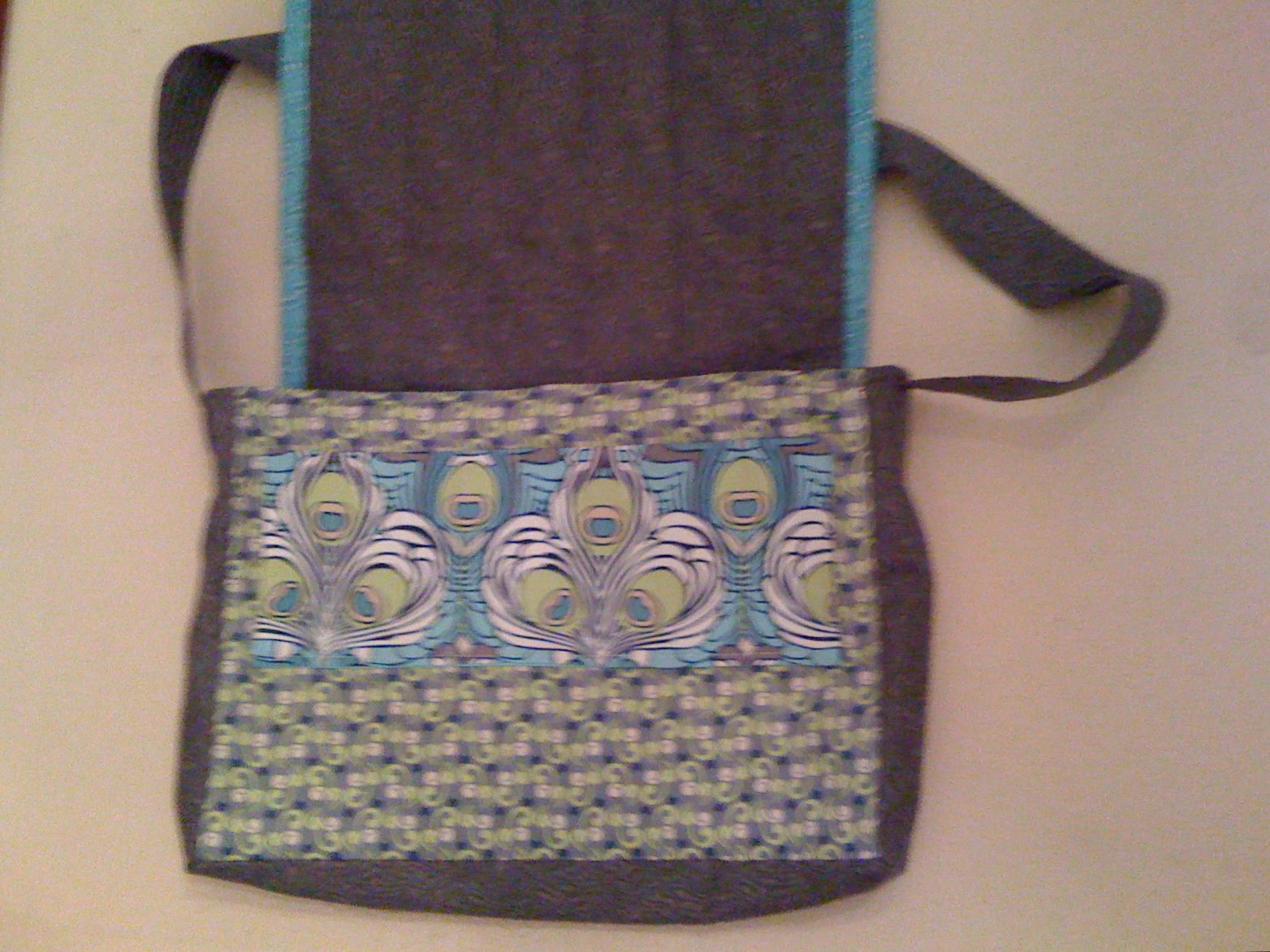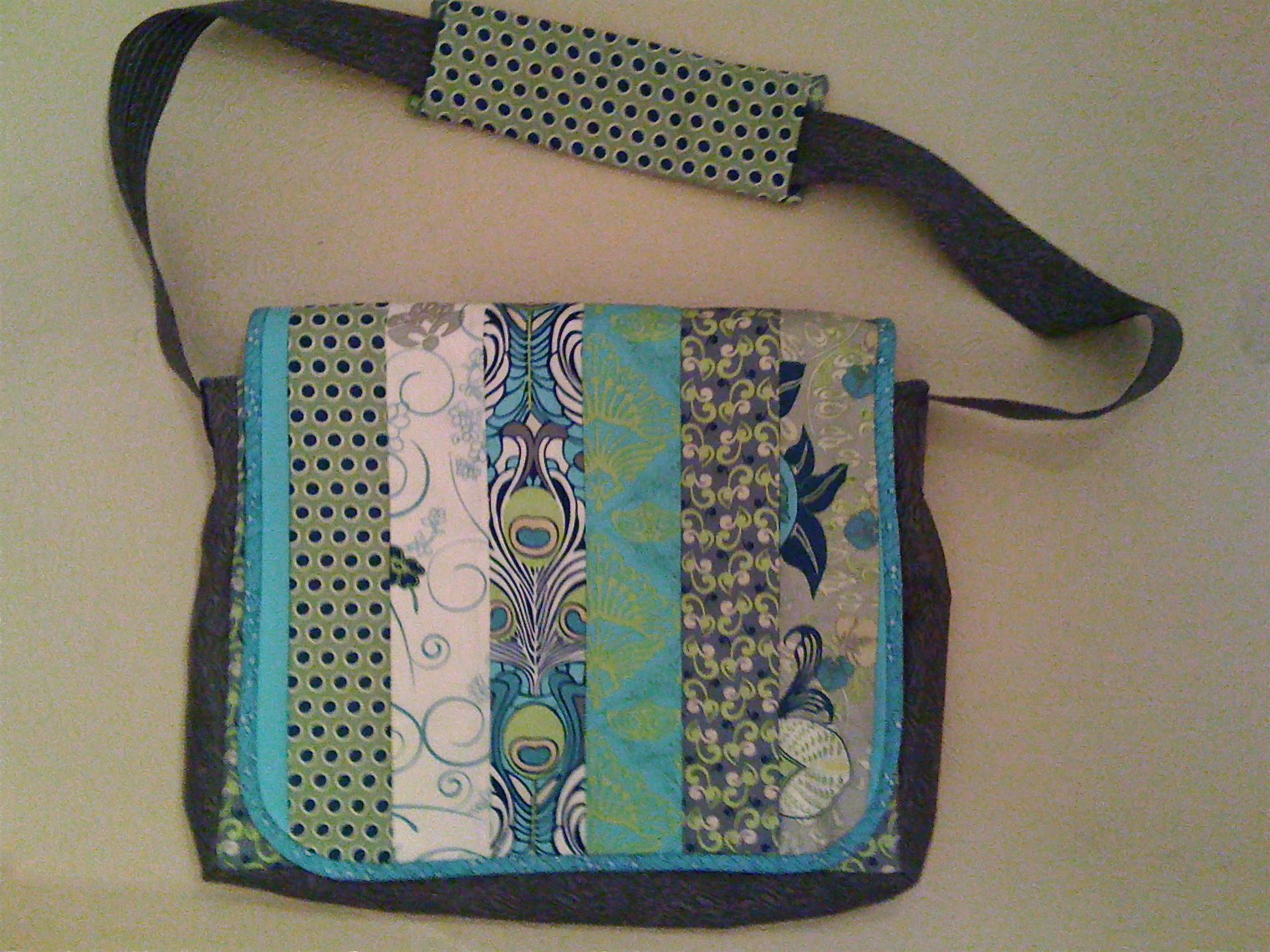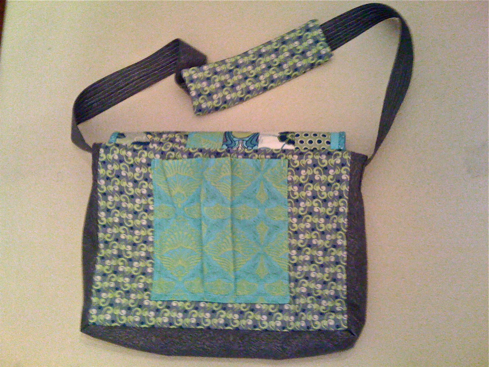 Here’s something I made this summer for my sister. I had so much fun doing it, and everything just worked. Considering I wasn’t using a pattern and just made it up as I went along, that’s pretty impressive. This is the front of the bag, oh, and these are the last of the cell phone pictures. Got a new camera before our vacation. I used a bunch of Art Gallery fabrics, one Michael Miller, and one really old Jinny Beyer that just worked in well.
