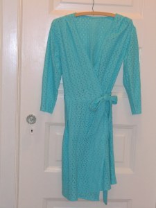 This is the back of the bag, complete with a pocket big enough for a paperback book. I also made a book cover with a beaded bookmark, but I didn’t get a picture of that. Now for the ugly. I’m of the opinion that most clothing pattern designers have never seen an actual human being. Maybe they were locked in caves in the 30s and forced to design patterns all these years. Maybe they’re aliens with odd proportions ’cause the measurements on the patterns don’t match up with any human I know. What I do know for sure, is that I am talented enough to read a clothing pattern, reproduce it in fabric, and wind up with something that I can’t wear. As if 10 years of 4H sewing didn’t prove that already. Sigh. Yes, people, I took measurements before I bought the pattern; yes I tried it on at various stages; yes I changed seam allowances and pleats. What I was trying to make was a wrap-around dress to use as a swimsuit coverup when we went to Florida last month. And this is what I got. It’s a fair approximation of the pattern, and pretty cute, despite the shapelessness hanging on a wooden hanger. It simply doesn’t fit. I think I’ll boycott any patterns that don’t include elastic or drawstrings.