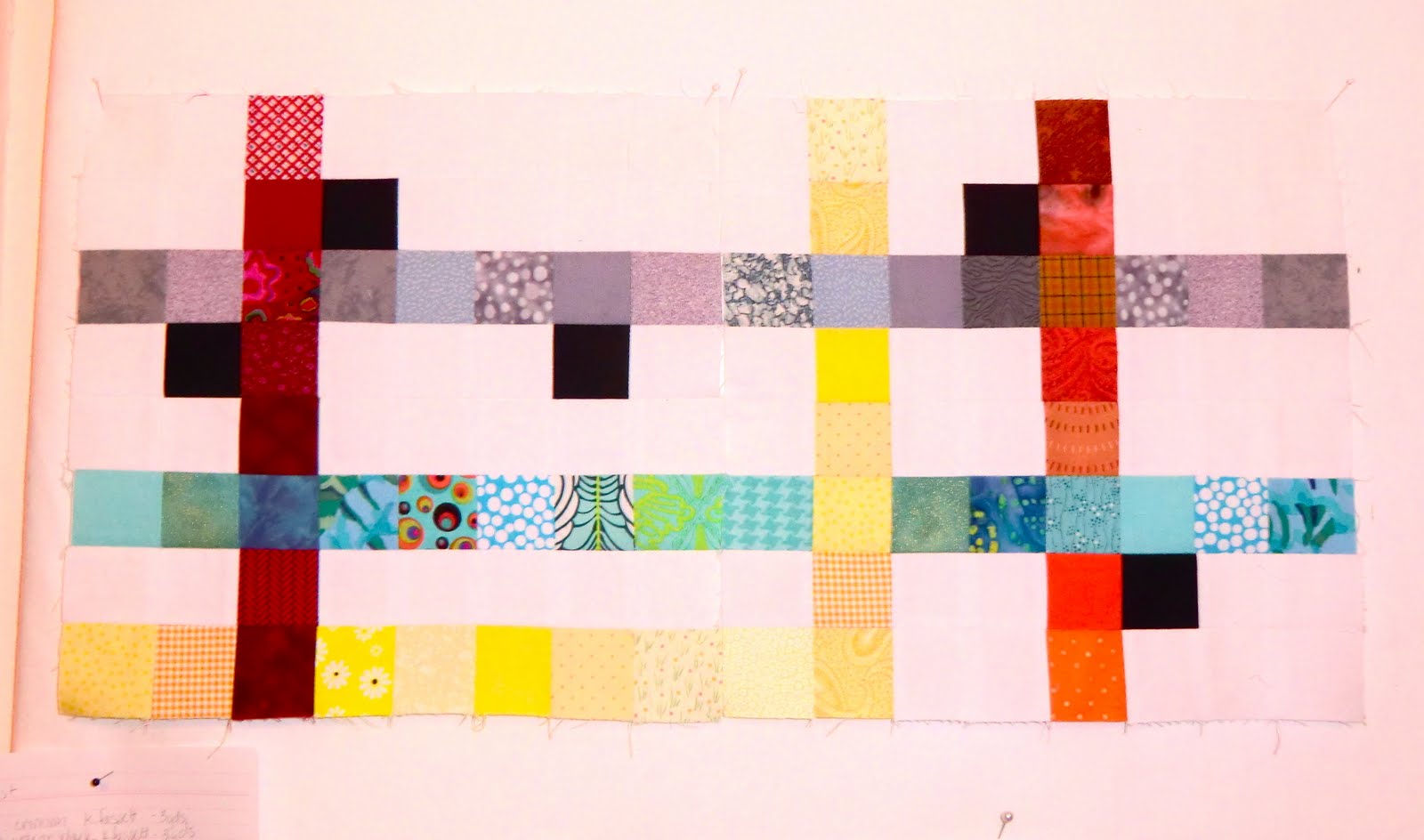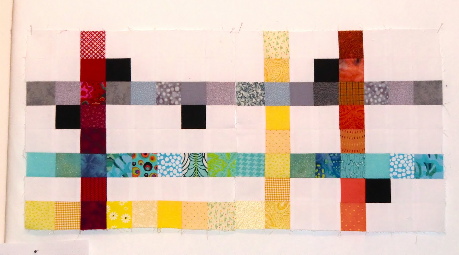 Right now on the design wall is Blocks 1 and 2 of Oh, Fransson’s Subway quilt. They’re turning out quite nicely.