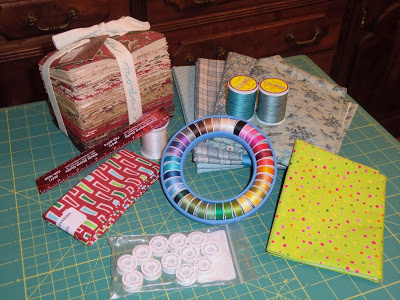 The bundle is fat eighths of Maison de Garance, the new line by French General. I just love their stuff. I may have to decorate a whole bedroom just with their fabrics. The blues are half yards of Rural Jardin. The round dealy is a frosted donut from Superior Threads. I love their products. I picked this up to use for hand applique. I often take applique projects with me when I travel (not that I work on them) and this will be better than carrying half my thread collection in a ziploc bag. Plus, most of my thread is packaged up with one project or another which means I can never find the color I need when I’m working on somthing else.