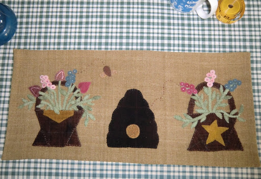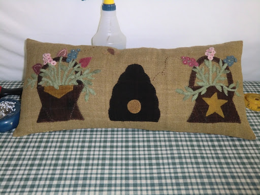 Here’s what I started with. This is wool pieces hand appliqued on a coarse silk background. The pattern is from Little Pieces by Joan. I did a pumpkin pillow of hers earlier.